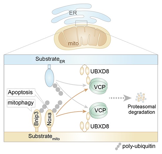 UBXD8是一个已知的VCP衔接蛋白,它通过N端的UBA (ubiquitin-associated)结构域结合泛素化修饰的底物,通过C端的UBX (ubiquitin regulatory X)结构域结合VCP,从而将底物呈递给VCP。之前的众多研究表明UBXD8定位在内质网和脂滴上调控蛋白降解。在研究线粒体蛋白降解途径的过程中,蒋辉实验室发现UBXD8经常与泛素化的线粒体蛋白一起共纯化出来,怀疑UBXD8与线粒体蛋白降解有未被报道的密切关系。