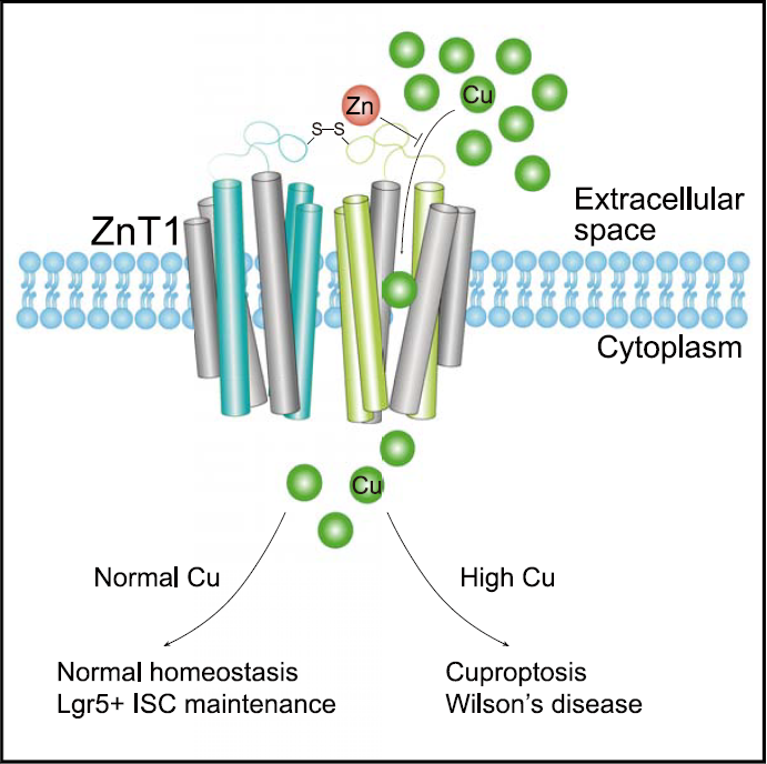 动物实验证明,肠上皮细胞中ZnT1蛋白缺失会导致小鼠锌离子吸收缺陷,从而导致小鼠死亡,但这种表型在补充锌离子后则不会发生。同时,ZnT1缺失抑制了肠上皮从血液中吸收铜,最终导致肠上皮铜含量降低,血清中铜含量升高。此外,研究人员还发现, ZnT1转运铜离子的功能对于维持Lgr5阳性肠干细胞是必需的,ZnT1的缺失会导致Lgr5阳性肠干细胞受损,而这一表型不能被外源锌离子的补充所拯救。