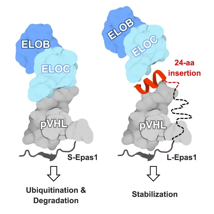 为探究L-Epas1与pVHL相互作用变强,但泛素化反而减弱的原因,研究人员对pVHL进行了突变和截短,发现除氧依赖性降解结构域(oxygen-dependent degradation domain,ODD)与pVHL的β结构域的识别作用外,24个氨基酸的插入片段还会与pVHL的C端α结构域产生额外的相互作用,从而增强了L-Epas1与pVHL的互作。