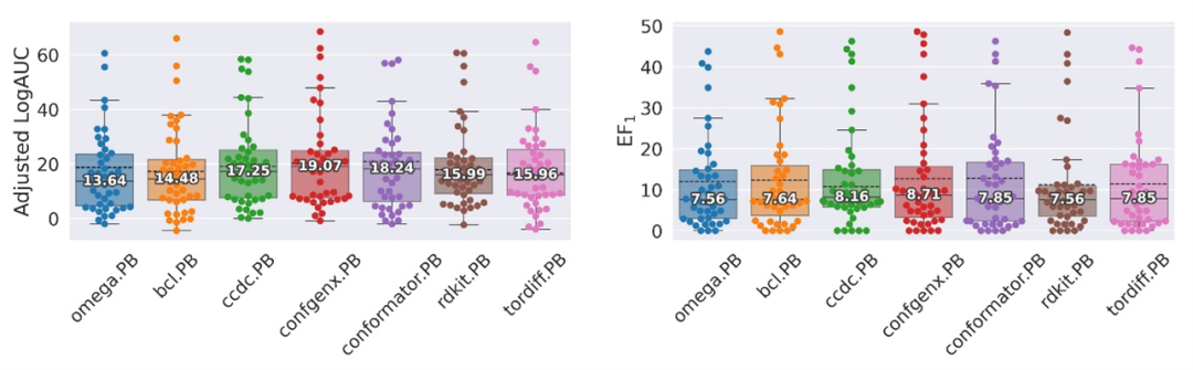 作者还在 DUDE-Z 数据集上测试了各采样方法在分子对接中的回顾性筛选能力。DUDE-Z 数据集包含 43 个已知蛋白靶标,每个靶标下有数十个已知活性小分子,每个活性小分子对应 50 个物理性质相似但结构不同的诱饵分子。筛选能力反映了对接软件从化合物库中富集活性小分子的能力。整体来看,ConfGenX 展现了较优的回顾性筛选能力,其 LogAUC 和 EF1 的中位数分别为 19.07 和 8.71。由于不同靶点的活性分子化学结构各异,且结合口袋的性质不同,采样方法在各靶点上的筛选能力表现出较大差异。具有不同采样偏好的方法在不同靶点上各自展现出最佳的筛选能力。