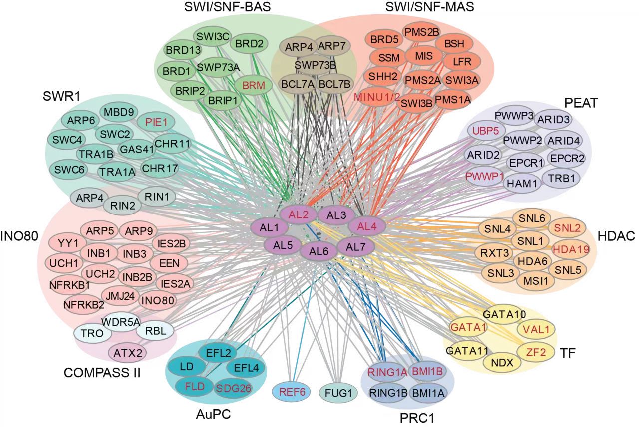 为了探究AL蛋白作用的分子机制,对拟南芥七个AL蛋白进行亲和纯化结合质谱分析,鉴定它们的结合蛋白。结果表明,AL蛋白能够与许多染色质相关蛋白或蛋白复合体互作(图2)。深入研究表明,AL蛋白N端的PAL结构域负责与这些染色质相关蛋白结合,而C-端的PHD结构域不是结合所必需。ChIP-seq分析表明,PAL和PHD这两个结构域对于AL蛋白在全基因组水平上与靶基因结合都具有重要作用。特别地,其中PHD结构域特异负责将AL蛋白招募到具有较高H3K4me3水平的靶基因上。