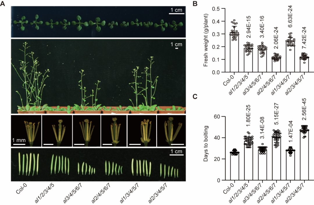 真核生物中组蛋白翻译后修饰能够通过影响染色质状态调控基因的转录。以往的研究表明,与动物中不同,植物中与转录抑制关联的组蛋白H2A单泛素修饰(H2Aub)在转录活跃基因上大量富集,然而富集的分子机制尚不清楚。AL蛋白家族是植物所特有,这类蛋白所具有的PHD结构域能够识别H3K4me3修饰,该修饰与基因的转录活跃相关联。本研究对拟南芥中的AL1~AL7七个蛋白进行了系统研究。利用T-DNA突变、CRISPR/Cas9诱导突变和遗传杂交,获得了单突体和不同组合的多突变体。研究表明,单突变体没有明显的生长发育表型,多突变表现明显的早花,而高阶多突变体出现明显的生长发育缺陷乃至致死,这表明拟南芥不同AL蛋白之间功能冗余,对植物的生长发育至关重要(图1)。
