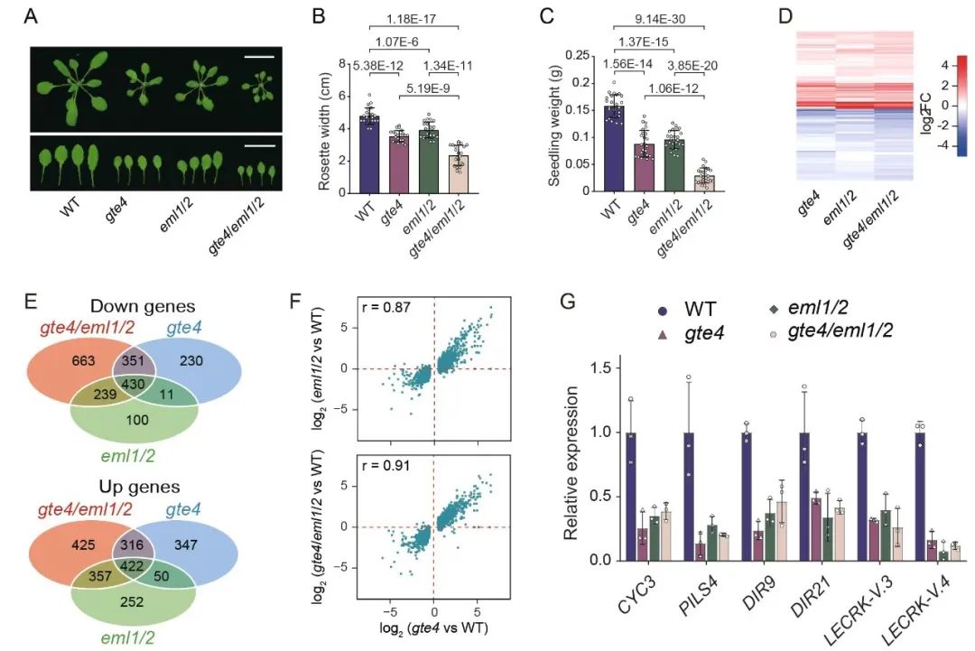 图2 GTE4和EML1/2共同调控基因表达和生长发育