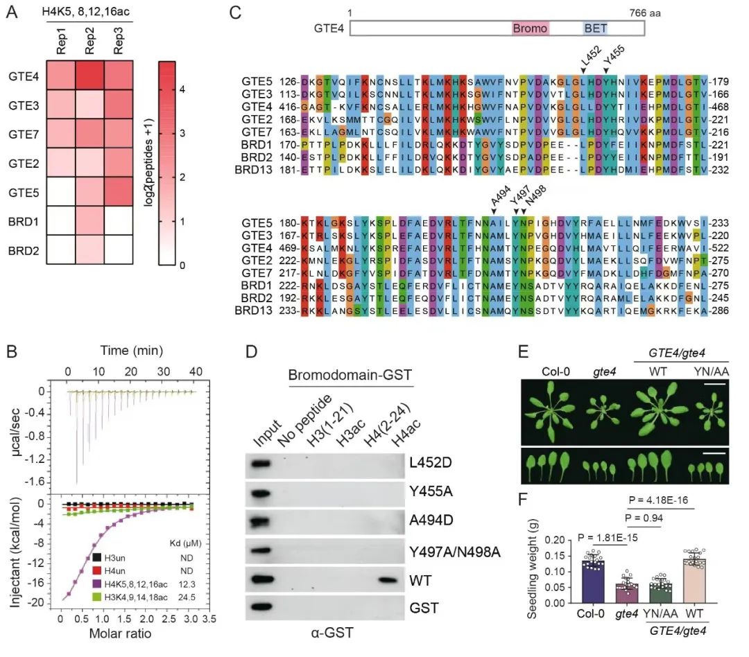 本研究发现拟南芥GTE4蛋白中的Bromo结构域能够特异识别组蛋白乙酰化修饰,其对组蛋白上不同赖氨酸位点的乙酰化基团的结合能力具有累加效应,并且对组蛋白H4乙酰化修饰的亲和力远高于对组蛋白H3乙酰化修饰的亲和力。对Bromo结构域中保守氨基酸进行突变能够完全阻断其对组蛋白乙酰化修饰的识别能力,揭示了其对组蛋白乙酰化修饰识别能力的特异性(图1)。