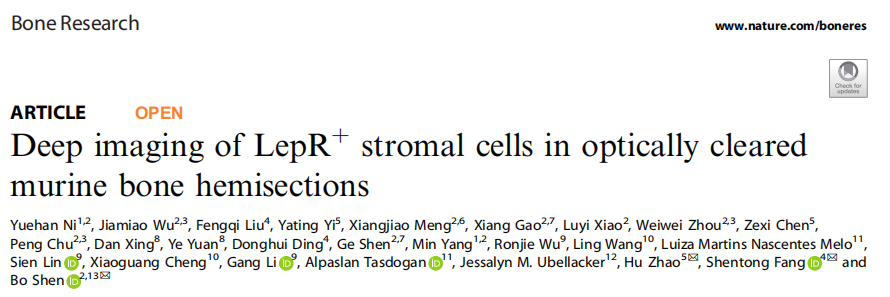 沈博实验室与中国药科大学方慎彤实验室及北京脑科学与类脑研究中心赵瑚实验室合作,在《Bone Research》杂志发表了题为 “Deep imaging of LepR+ stromal cells in optically cleared murine bone hemisections" 的研究论文。该研究开发了一种高效便捷的组织透明化和三维成像技术,尤其适用于骨髓微环境的深层成像。
