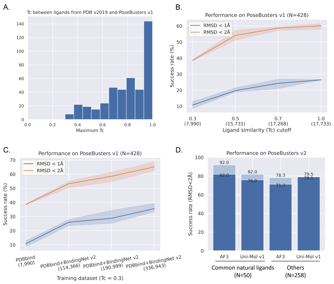 黄牛实验室于《npj Drug Discovery》杂志在线发表题为“Augmented BindingNet dataset for enhanced ligand binding pose predictions using deep learning ”的研究论文。在BindingNet v1数据集的模板匹配技术基础上,创新性地提出了基于片段化结合形状与静电匹配的多层次模板匹配流程,成功构建出规模远超BindingNet v1近十倍规模的蛋白-配体相互作用数据集— BindingNet v2。此数据集覆盖1794个蛋白靶点,包含689,796个蛋白-小分子配体复合体结构模型及其相应的实验活性数据,极大地提升了AI模型在蛋白-配体复合体预测任务上的泛化能力。尤其在仅使用Tc < 0.3的数据(不包含同测试集中结构类似的分子)训练时,Uni-Mol模型在PoseBusters测试集上的泛化能力从38.55%大幅跃升至74.07%。
