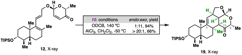作者通过路易斯酸AlCl3的精准调控,在低温下实现了三烯化合物12的分子内endo-selective Diels–Alder反应,成功构建了目标天然产物中拥挤的C环结构。而如果直接通过加热进行Diels–Alder反应,则会立体选择性地获得exo环化产物。