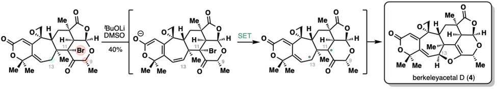 最后一步,作者通过化学选择性去质子化即直接获得了目标天然产物berkeleyacetal D,详细的机理研究表明这步化学转化的机理涉及共轭烯醇负离子通过分子内单电子转移(SET)还原分子内的三级溴化物,进而巧妙地实现2,3-二氢呋喃环的构建。此外,机理研究表明,光照可促进该过程,但作者最终选择不额外加光的条件以避免副反应。