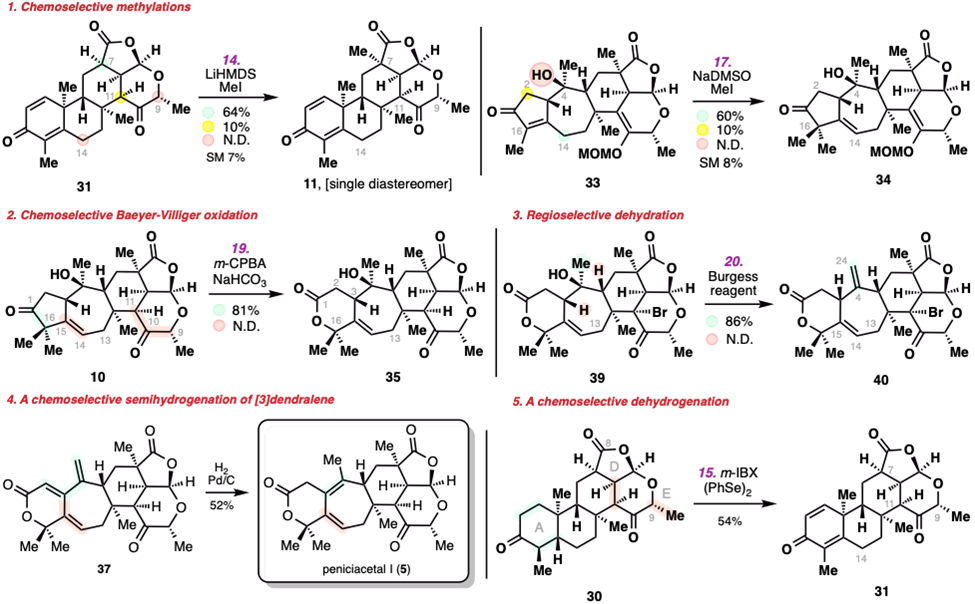 鉴于目标天然产物分子的复杂性和高氧化性,除了上述endo-selective Diles–Alder反应,在此合成路线中,还涉及到非常多的选择性问题,而这些选择性的问题都被作者通过反应条件的优化得到解决:这包括化学选择性和立体选择性的甲基化反应,Baeyer-Villiger氧化反应,三级醇的脱水反应,酮的a, b-脱氢反应,氢化反应等等。