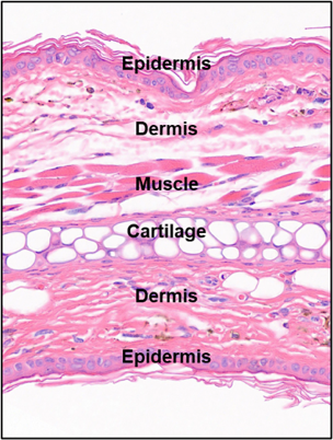 表皮(Epidermis)、真皮(Dermis)、肌肉(Muscle)、软骨(Cartilage)、真皮(Dermis)、表皮(Epidermis)