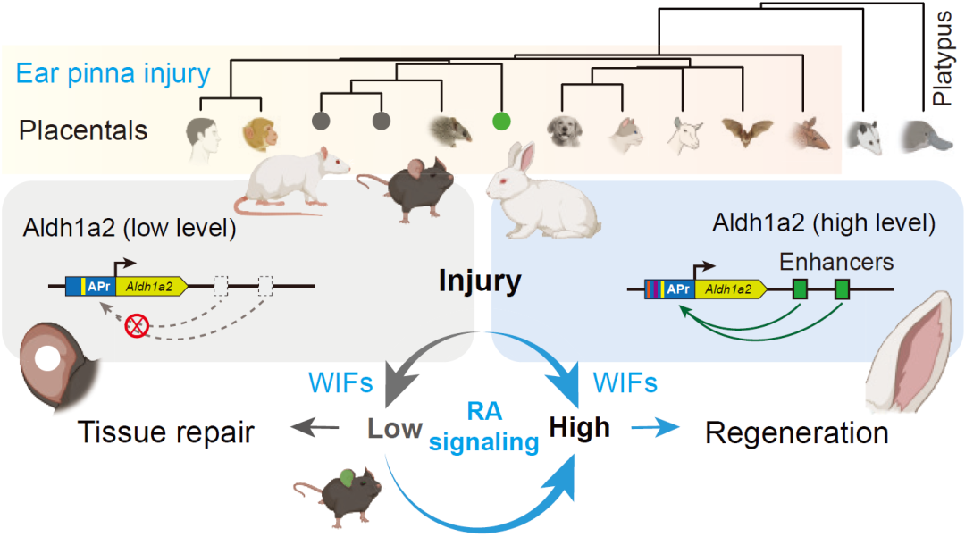 再生能力演化模型。在小鼠和大鼠中,Aldh1a2基因关联的增强子活性的丢失导致视黄酸限速合成酶在损伤后表达不足,进而引起视黄酸信号通路活性较低、无法诱导WIFs进行形态发生产生新的组织。激活RA信号通路让小鼠及大鼠重新获得再生能力。