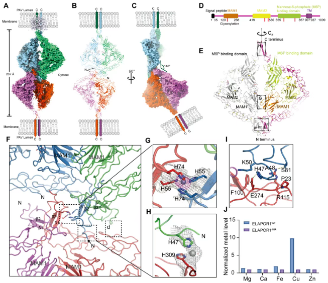 电镜结构分析发现ELAPOR1先形成顺式同源二聚体,然后以“头对头”同源相互作用组装形成反式四聚体结构,四聚体的形成是通过铜离子介导的,暗示ELAPOR1可能作为膜拴系因子介导囊泡间互作靠近,促进其后的融合。要发挥栓系因子的作用其N端必须位于囊泡膜外,而理论预测正好相反,我们惊奇的发现ELAPOR1在囊泡上两种方向都存在,即具有双向拓扑性,体外囊泡捕获实验进一步证明ELAPOR1可以通过头对头的同源相互作用实现囊泡之间的拴系。在体内,铜结合位点突变(TG-4HA)小鼠表现出与Elapor1敲除小鼠一样的顶体形成缺陷等表型,明确证明ELAPOR1可通过铜依赖的四聚体结构调控PAV融合,是顶体发生过程中的关键调控分子。