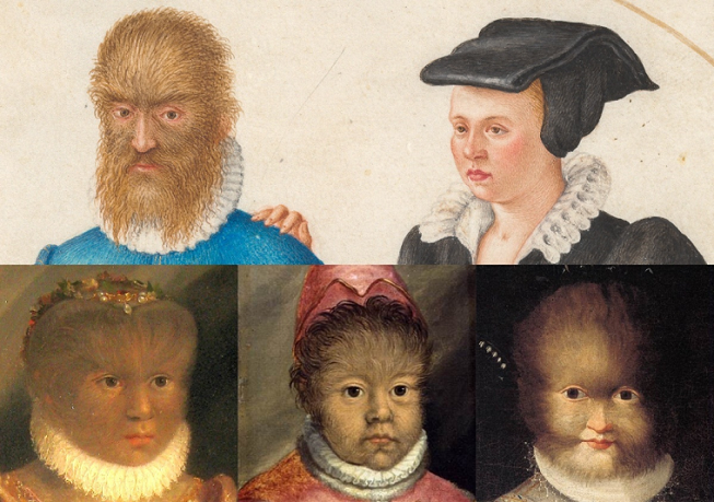 世界上首次有记录的先天性全身多毛症患者Petrus Gonsalvus(1537-1618)及其妻子(上排)和子女(下排)。