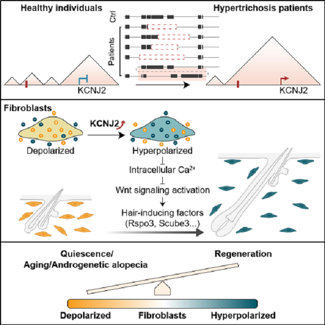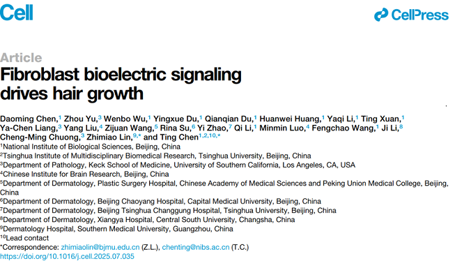 交叉医学研究院陈婷团队在《Cell》期刊在线发表了题为“Fibroblast bioelectric signaling drives hair growth”的研究论文。该研究首次发现,皮肤成纤维细胞的膜电位状态是毛发再生的关键调控因素:超极化促进毛发生长,而去极化则抑制毛发生长。在先天性多毛症患者中,染色体构象变化导致KCNJ2基因在成纤维细胞中特异性上调。进一步机制研究表明,KCNJ2的上调引起膜电位超极化,从而通过降低细胞内钙浓度增强Wnt信号响应,最终促进毛发再生。此外,KCNJ2介导的超极化在雄激素性脱发及老年小鼠模型中同样可以促进毛发生长,显示出良好的临床应用潜力。