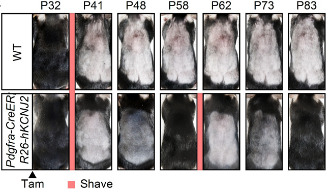 野生型小鼠(WT)与成纤维细胞特异性过表达KCNJ2小鼠(Pdgfra-CreER;R26-hKCNJ2)的毛发再生情况对比。