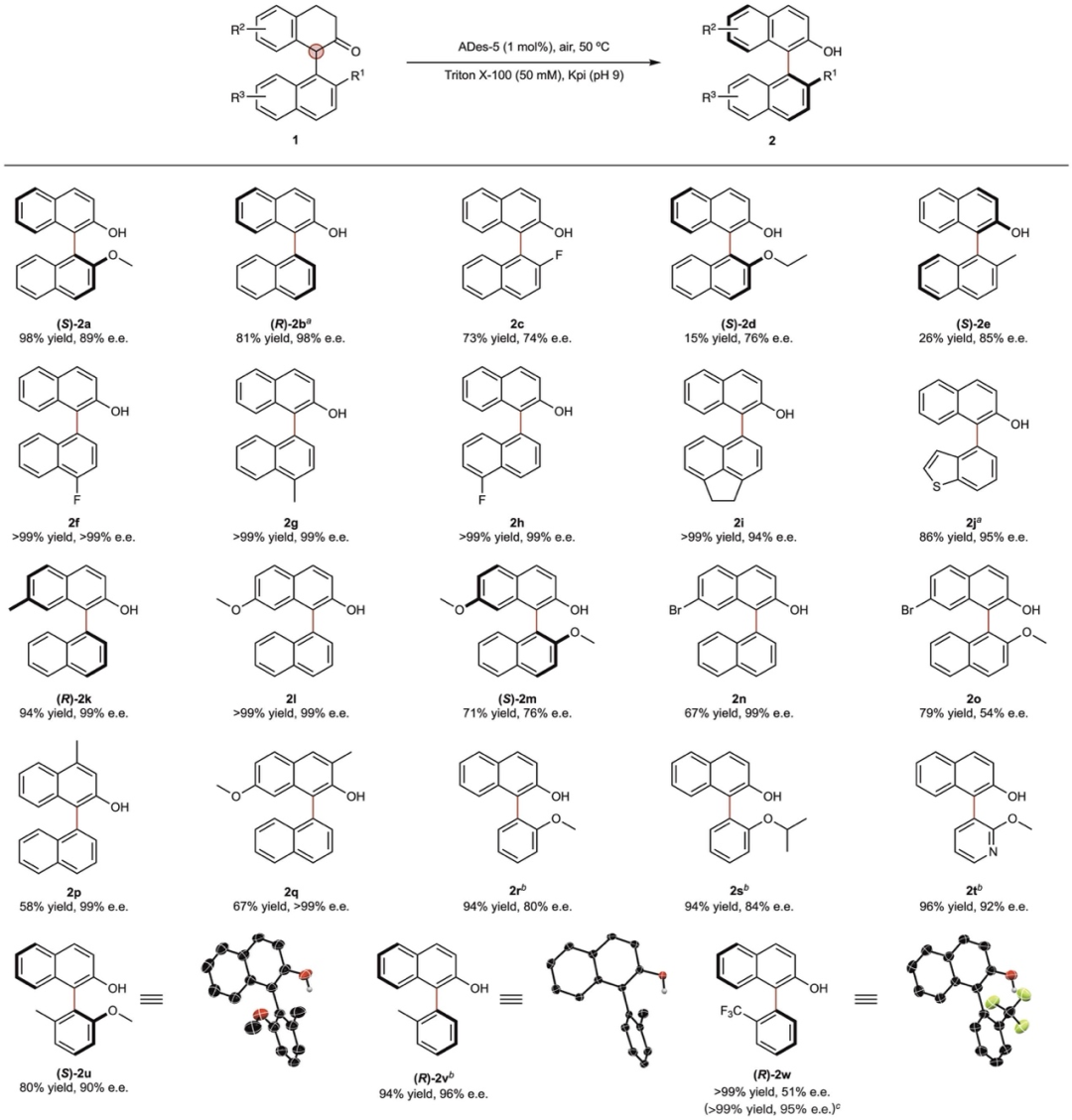 在确定最优变体ADes-5后,作者评估了其在多种1-芳基-2-四氢萘酮衍生物上的适用性。结果表明该酶对芳环的各种取代基都表现出显著的耐受性,无论是卤素、杂环还是氧化敏感的底物,均可被高效转化为目标联芳基产物,且具有良好的产率与对映选择性。除了1-萘基取代的四氢萘酮类化合物外,含有单芳环的底物也可以转化为相应的联芳基产物。值得注意的是, ADes-5在低温条件 (4 °C) 下对某些在常温下易发生消旋化的底物依然保持良好的去饱和活性,表明该酶在较宽的温度范围 (4–50 °C) 内仍具有良好的稳定性和催化能力。随后,实验人员成功将这该酶催化反应成功放大至毫摩尔级别,所获得的联芳基产物中的酚羟基部分可通过 O-磺酰化和钯催化的交叉偶联反应,高效转化为多种功能化衍生物,包括芳基、硼基和膦基联芳基化合物,而且在这些偶联条件下没有观察到显著的消旋化,这进一步证明了该酶催化方法的实用性和目标产物的合成价值。