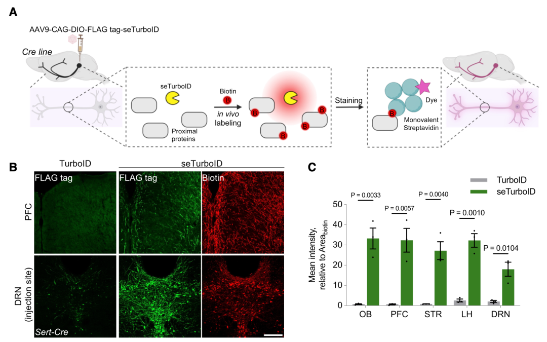 LINCS 利用邻近标记(proximity labeling)方法,通过结合 Cre 依赖型 AAV 与特定 Cre 转基因小鼠品系在神经元中表达可溶性增强型工程化生物素连接酶(solubility-enhanced TurboID, seTurboID),并为小鼠提供生物素饮水。生物素扩散入细胞后被 seTurboID 催化,共价标记至胞内蛋白,完成神经元的高效在体生物素化(图1)。随后,LINCS通过荧光染料偶联的链霉亲和素(Streptavidin)进行全脑染色,将生物素标记转化为荧光信号,从而实现细胞类型和神经环路特异性的靶向神经元标记。