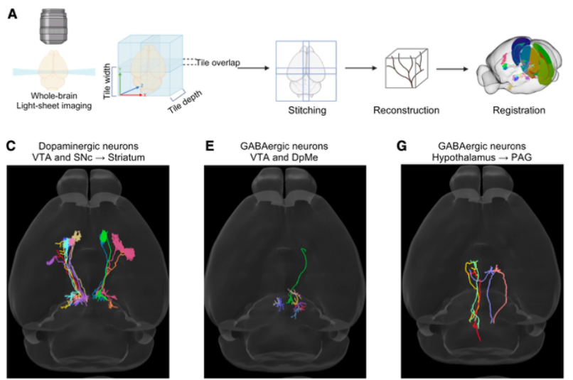 为实现全脑单神经元重构,研究者将LINCS与多种稀疏标记策略整合,包括团队前期开发的双AAV稀疏标记系统(dual-AAV sparse labeling)6,以及本工作新开发的基于CRISPR/Cas9介导Cre基因敲除的稳定稀疏标记系统(Cre-KO sparse labeling)。运用该整合平台,研究者成功重构了11个纹状体投射的中脑多巴胺能神经元、7个中脑GABA能神经元及5个导水管周围灰质(periaqueductal gray)投射的下丘脑GABA能神经元。相较于目前主流单细胞重构平台,基于LINCS的方案在成像效率(约0.3天/全脑 vs 7-14天)和数据量(约100GB/全脑 vs >10TB)上均实现数量级优化。
