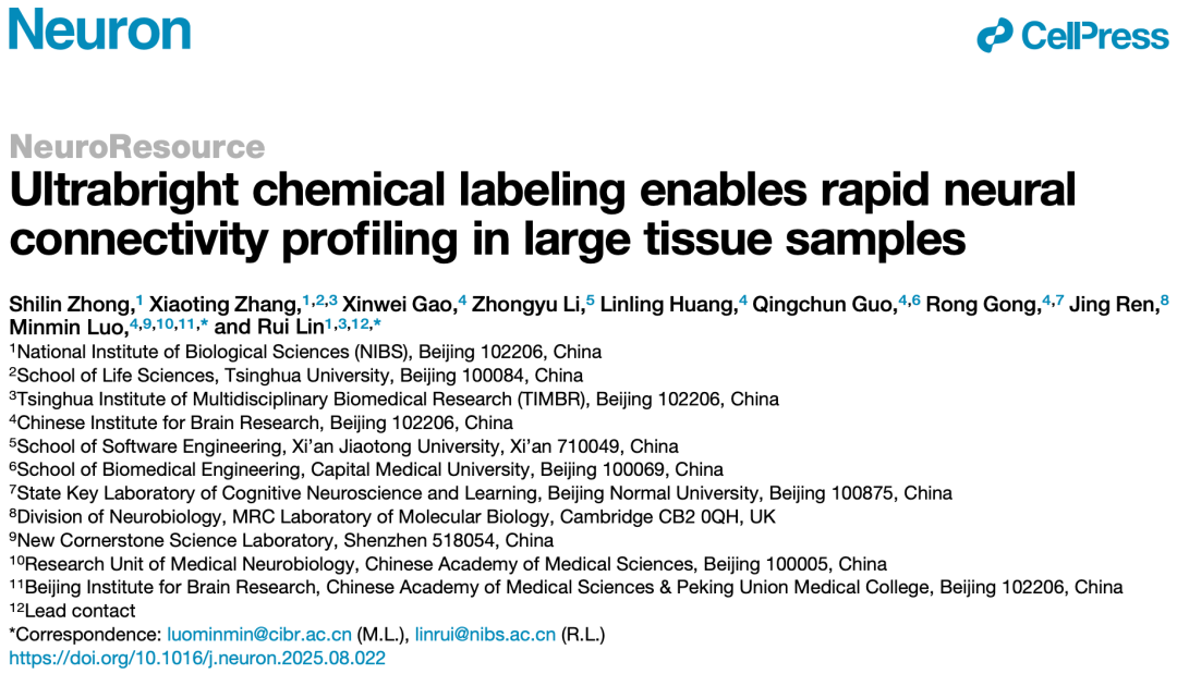 林睿实验室与北京脑科学与类脑研究所罗敏敏实验室在《Neuron》期刊在线发表了题为“Ultrabright Chemical Labeling Enables Rapid Neural Connectivity Profiling in Large Tissue Samples ”的NeuroResource文章,提出了一种高亮的小鼠全脑/全身神经元快速化学荧光标记方法LINCS(Labeling Individual Neurons with Chemical dyes and Controllable Sparseness)。该方法兼容组织透明化方法与光片显微成像技术,并简化了样本制备流程,实现快速、高亮且均匀的标记。同时,该研究开发了稳定稀疏度的神经元稀疏标记策略,通过将LINCS与不同的稀疏标记策略结合,建立了新一代基于光片显微成像的全脑单神经元重构方案。